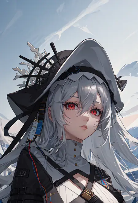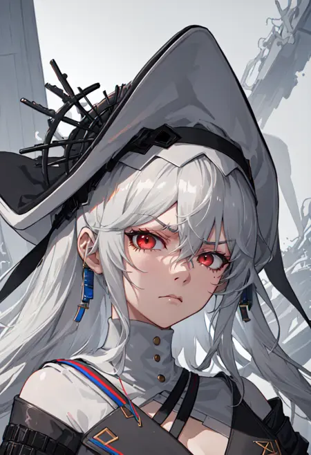 The trigger word is specter_arknights, and the pruned tags are long_hair, red_eyes, grey_hair, hair_between_eyes, black_headwear, very_long_hair, breasts, white_hair, hat. When some features (e.g. hair color) are not so stable at some times, you can add these them into your prompt.