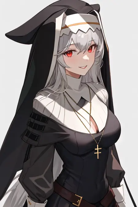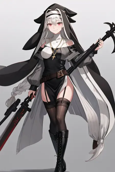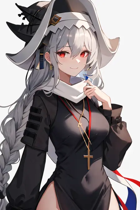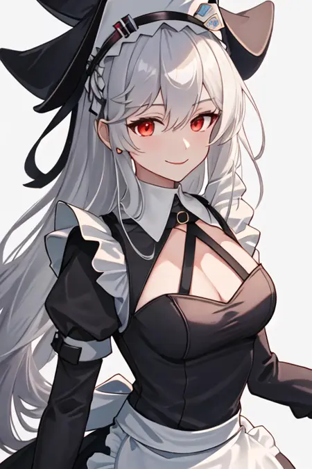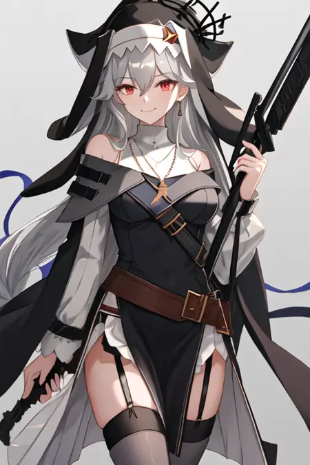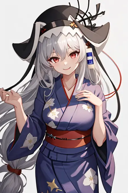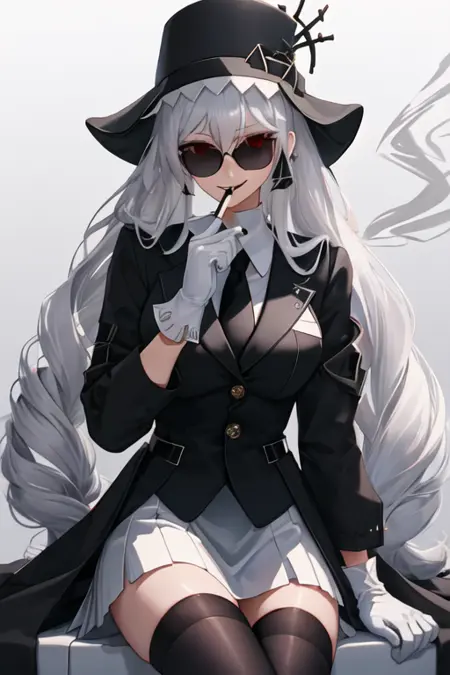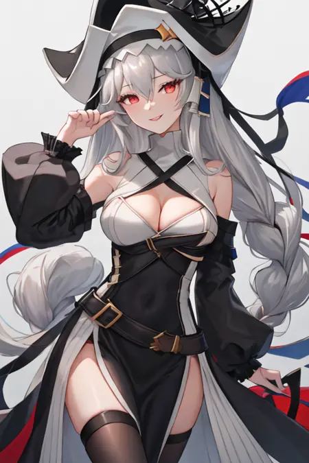触发词为 specter_arknights,精简标签为 long_hair, red_eyes, grey_hair, hair_between_eyes, black_headwear, very_long_hair, breasts, white_hair, hat。当某些特征(如发色)有时不够稳定时,您可以在提示词中添加这些标签。
