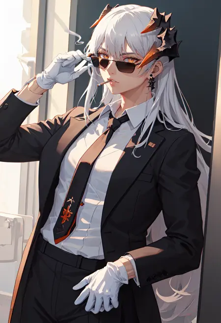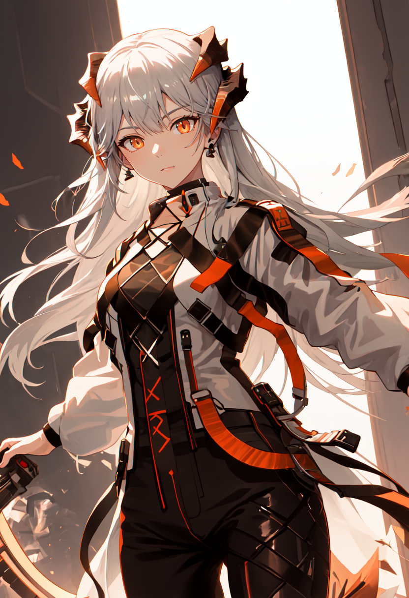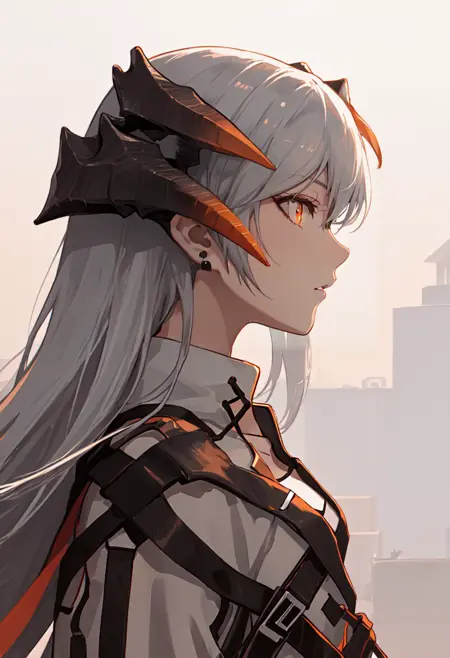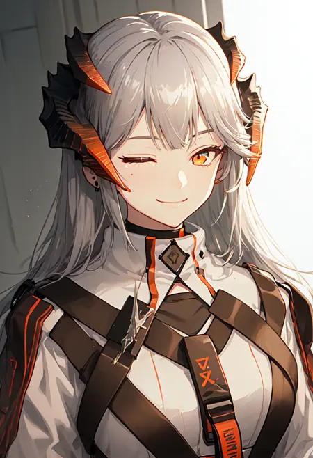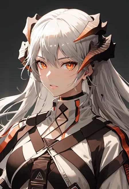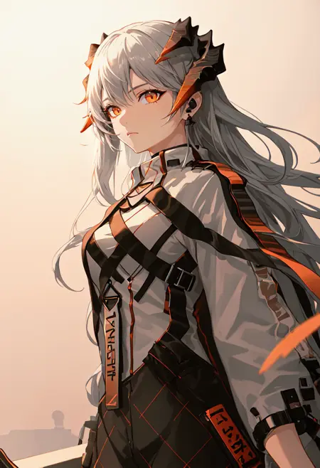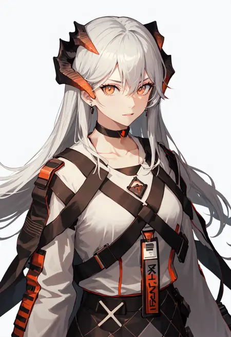触发词为 saria_arknights,精简标签为 horns, long_hair, dragon_horns, grey_hair, orange_eyes, breasts, earrings, tail当某些特征(如发色)偶尔不稳定时,您可以在提示词中添加这些标签