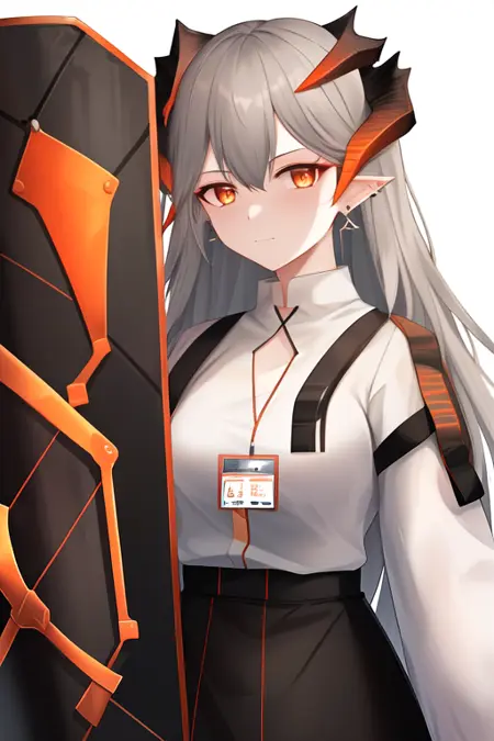 触发词为 saria_arknights,精简标签为 horns, long_hair, dragon_horns, grey_hair, orange_eyes, breasts, earrings, tail。当某些特征(如发色)偶尔不稳定时,您可以在提示词中添加这些标签。
