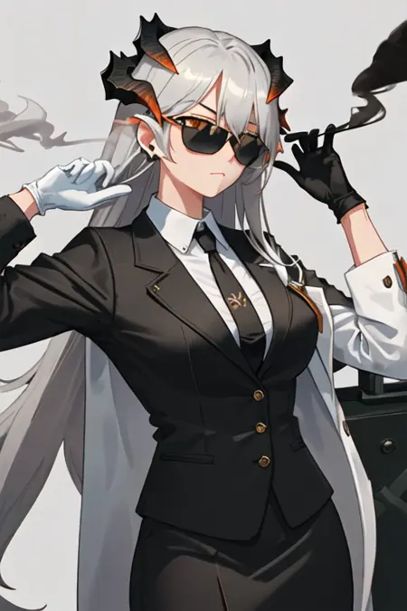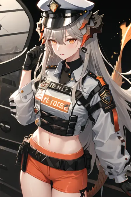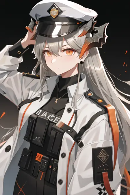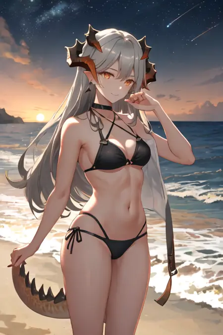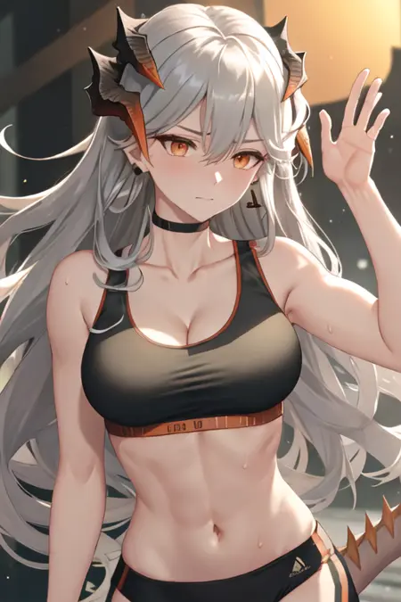 - The pruned character tags are horns, long hair, dragon horns, grey hair, orange eyes, breasts, earrings, tail. You can add them into prompts when core features (e.g. hair color) of character is not so stable.