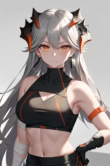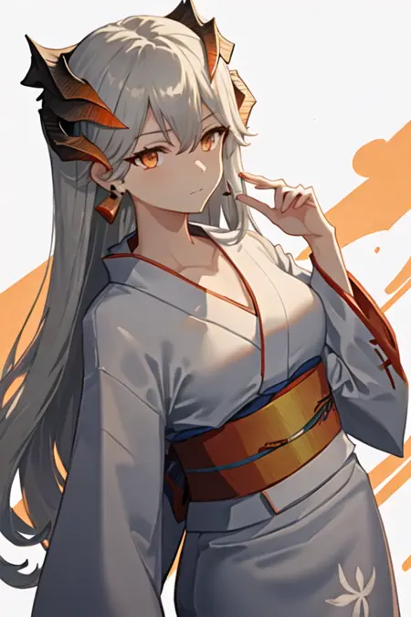 - 축소된 캐릭터 태그는 뿔, 긴 머리카락, 드래곤 뿔, 회색 머리카락, 주황색 눈, 가슴, 귀걸이, 꼬리입니다. 캐릭터의 핵심 특징(예: 머리카락 색상)이 안정적이지 않을 때这些 태그를 프롬프트에 추가할 수 있습니다.