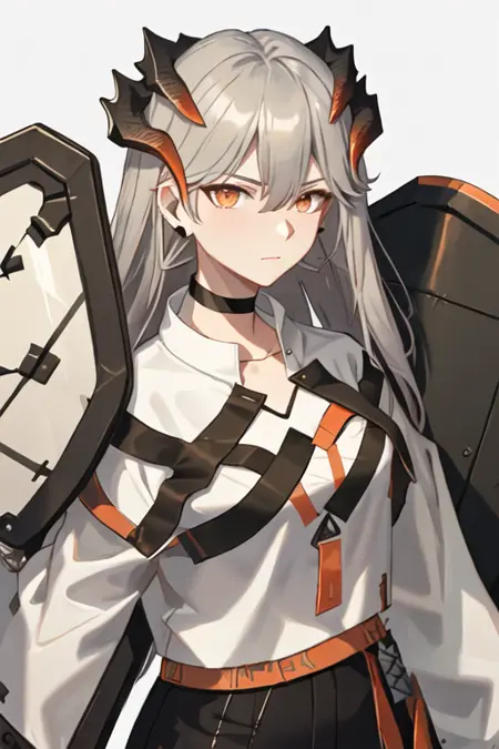 The trigger word is saria_arknights, and the pruned tags are horns, long_hair, dragon_horns, grey_hair, orange_eyes, breasts, earrings, tail. When some features (e.g. hair color) are not so stable at some times, you can add these them into your prompt.