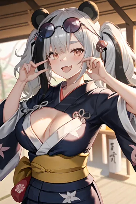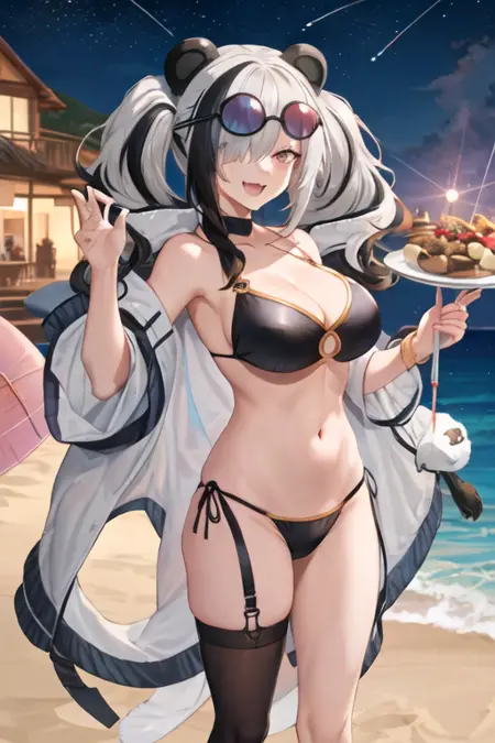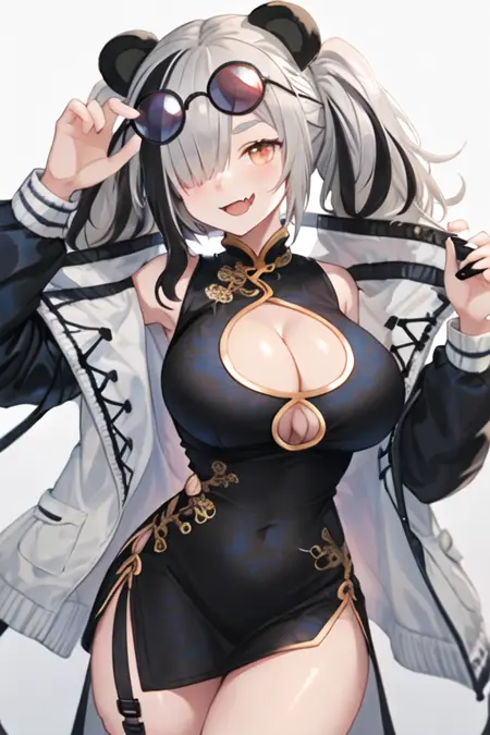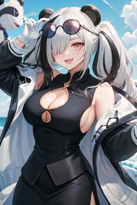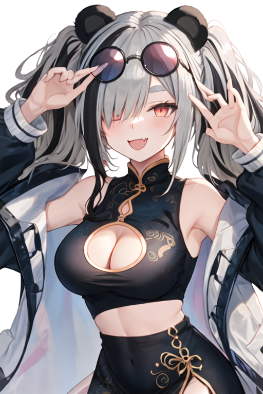 触发词为 feater_arknights,精简标签为 animal_ears, multicolored_hair, black_hair, grey_hair, streaked_hair, breasts, panda_ears, twintails, large_breasts, sunglasses, hair_over_one_eye, long_hair, eyewear_on_head, two-tone_hair, fang, round_eyewear, red_eyes。当某些特征(如发色)有时不够稳定时,您可以将这些标签添加到提示词中。