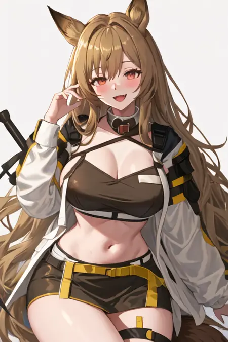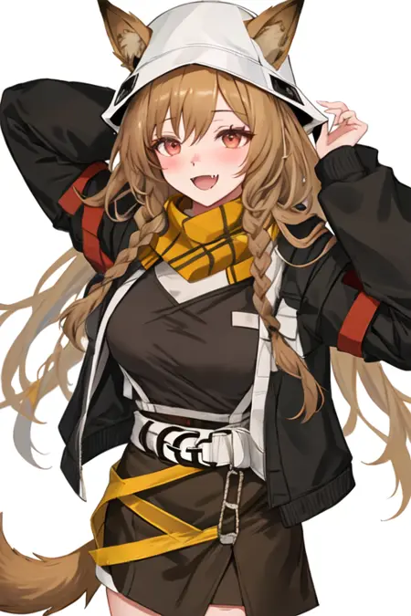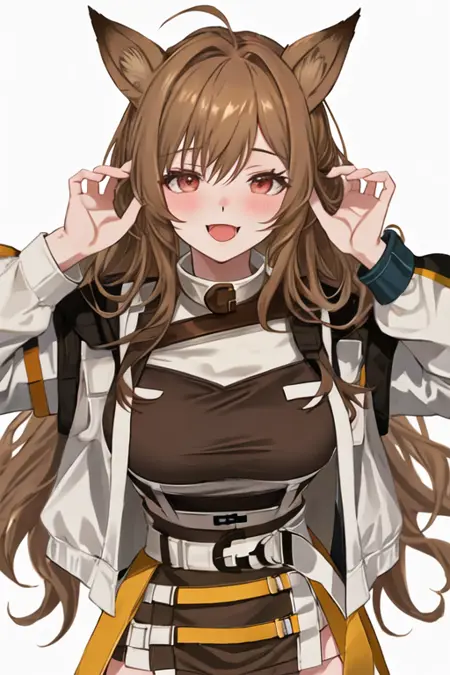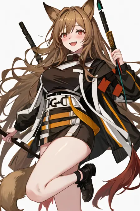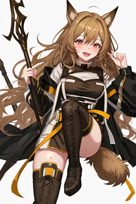 The trigger word is ceobe_arknights, and the pruned tags are animal_ears, long_hair, dog_ears, brown_hair, dog_girl, red_eyes, breasts, very_long_hair, tail, hair_between_eyes, dog_tail, fang. When some features (e.g. hair color) are not so stable at some times, you can add these them into your prompt.