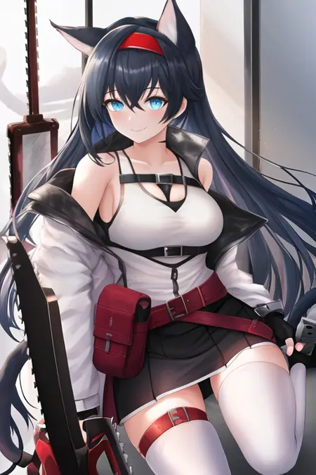 The trigger word is blaze_arknights, and the pruned tags are animal_ears, long_hair, cat_ears, black_hair, blue_eyes, hairband, red_hairband, breasts, very_long_hair, large_breasts, tail, cat_tail, cat_girl, hair_between_eyes. When some features (e.g. hair color) are not so stable at some times, you can add these them into your prompt.