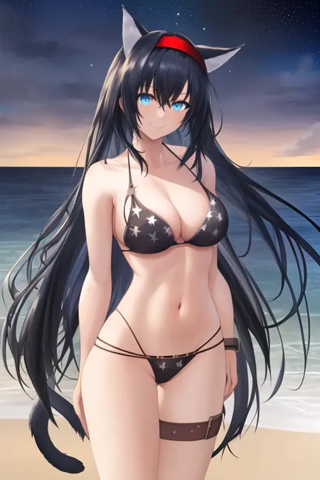 - The pruned character tags are animal ears, long hair, cat ears, black hair, blue eyes, hairband, red hairband, breasts, very long hair, large breasts, tail, cat tail, cat girl, hair between eyes. You can add them into prompts when core features (e.g. hair color) of character is not so stable.