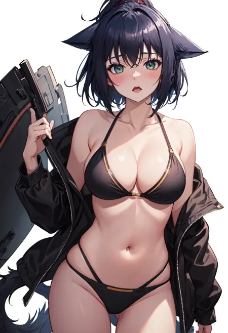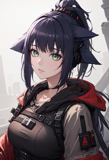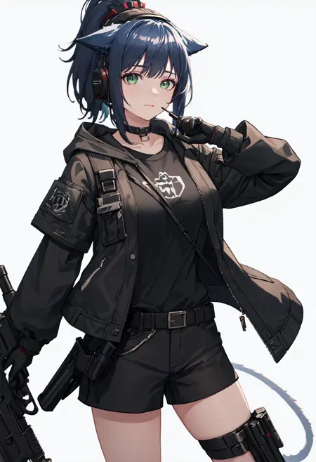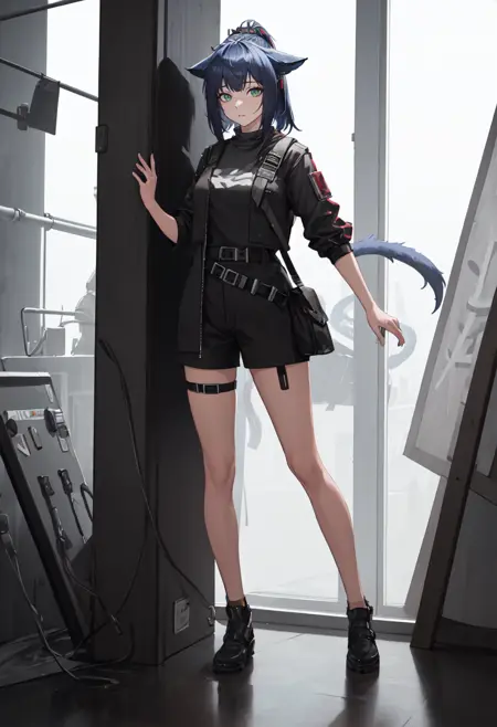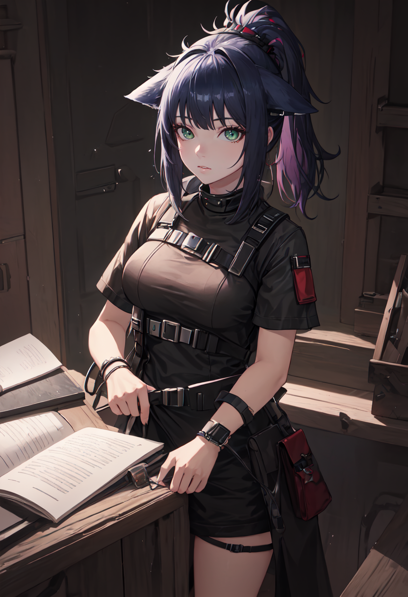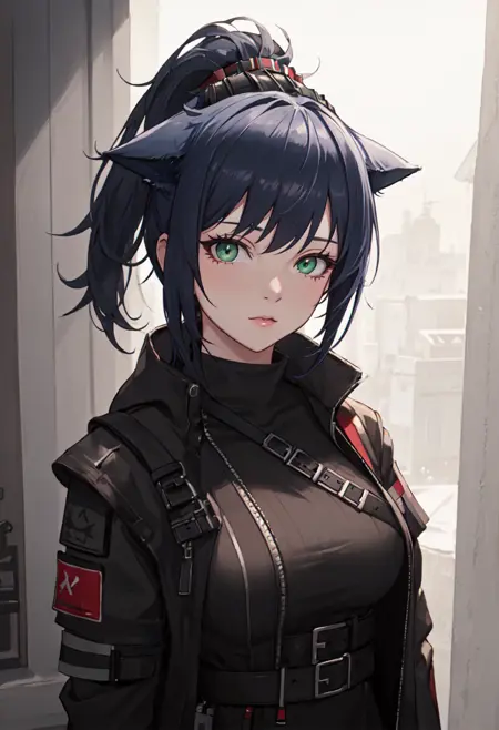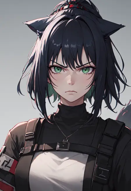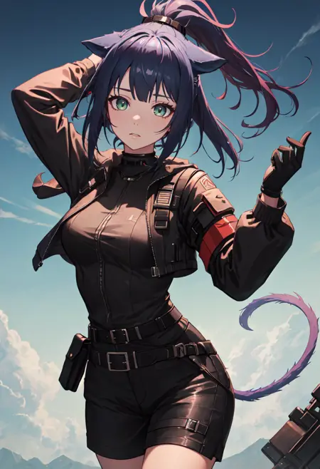 트리거 단어는 jessica_arknights이며, 축소된 태그는 animal_ears, cat_ears, ponytail, green_eyes, multicolored_hair, cat_girl, blue_hair, tail, cat_tail, black_hair, breasts, long_hair입니다. 어떤 특징(예: 머리색)이 불안정할 때, 이러한 태그를 프롬프트에 추가하세요.