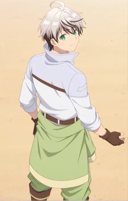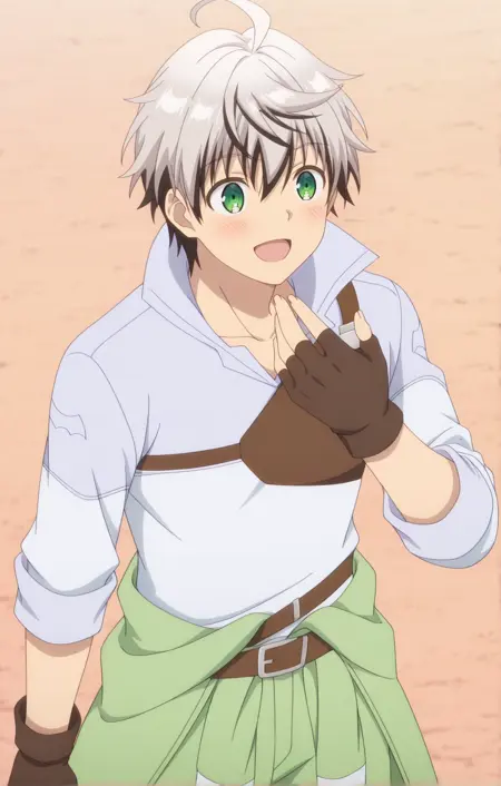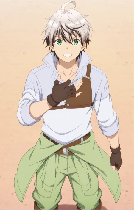 clothes, fingerless gloves, brown gloves, green pants, belt, white shirt, brown boots, collared shirt, high collar, popped collar, green clothes around waist,