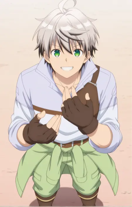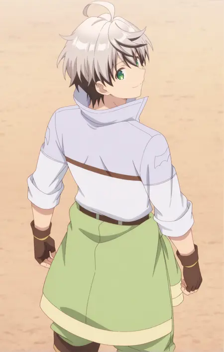 clothes, fingerless gloves, brown gloves, green pants, belt, white shirt, brown boots, collared shirt, high collar, popped collar, green clothes around waist,