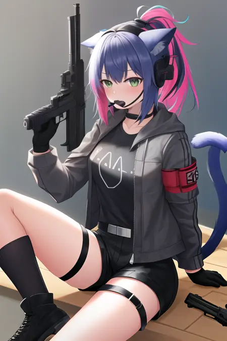 触发词为 jessica_arknights,精简标签为 animal_ears, cat_ears, ponytail, green_eyes, multicolored_hair, cat_girl, blue_hair, tail, cat_tail, black_hair, breasts, long_hair。当某些特征(如发色)有时不够稳定时,您可以将这些标签添加到提示词中。
