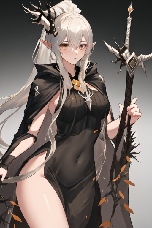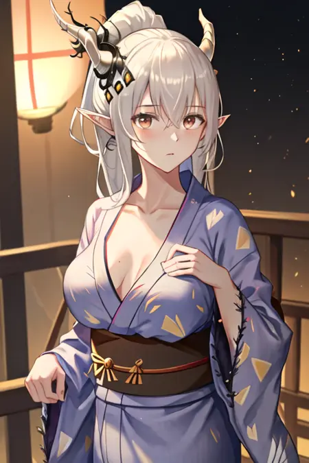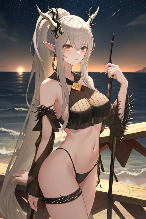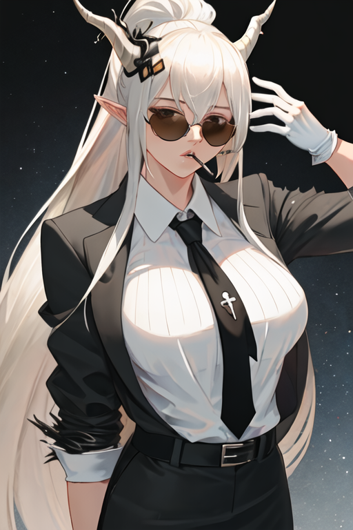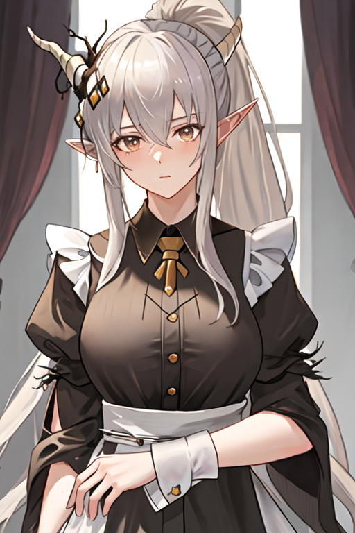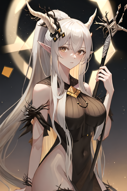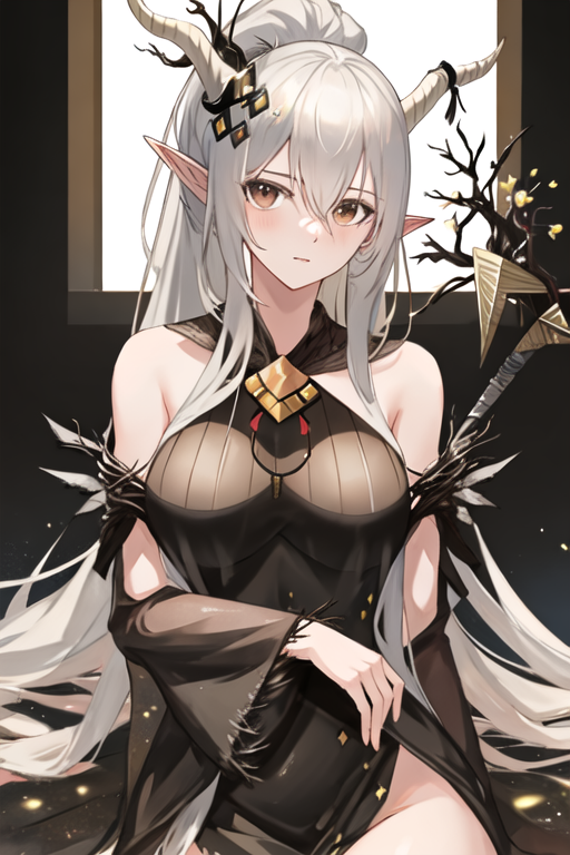 - The pruned character tags are long hair, horns, breasts, hair between eyes, pointy ears, very long hair, white hair, large breasts, ponytail, brown eyes, red eyes. You can add them into prompts when core features (e.g. hair color) of character is not so stable.