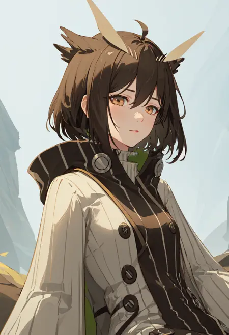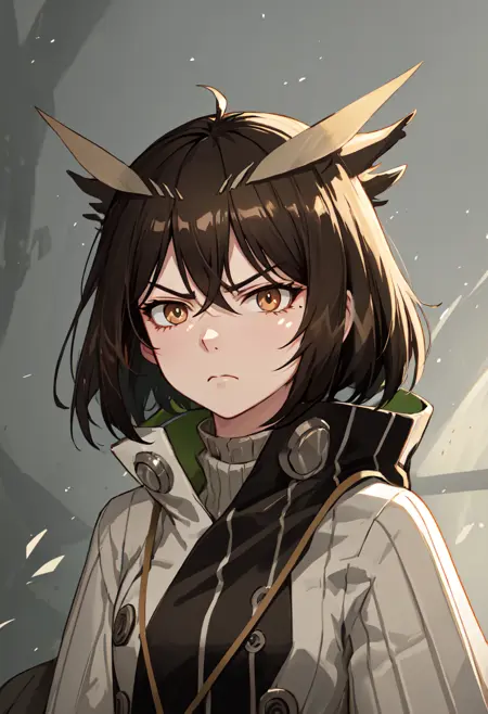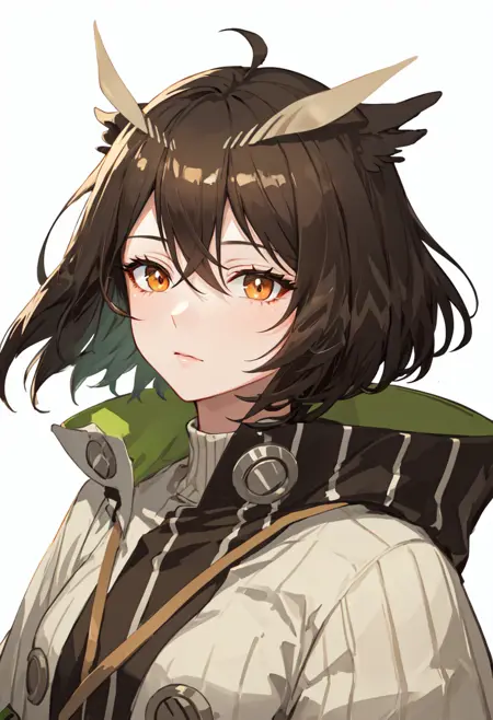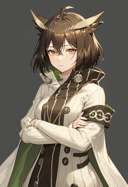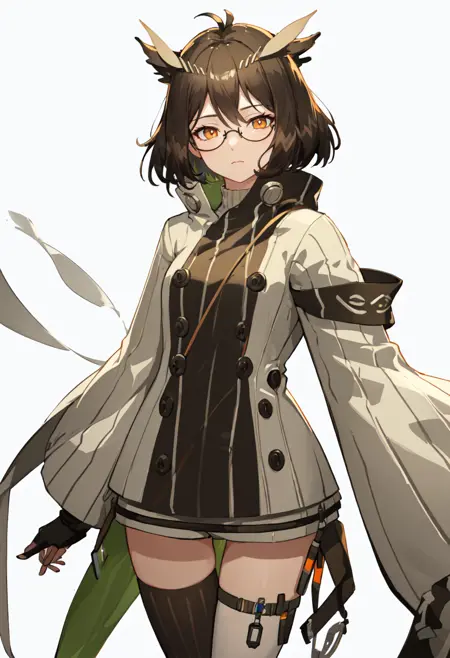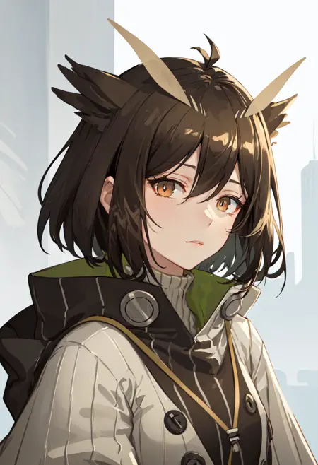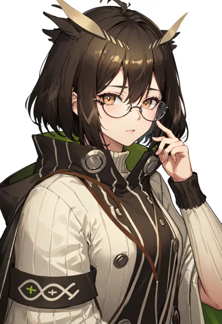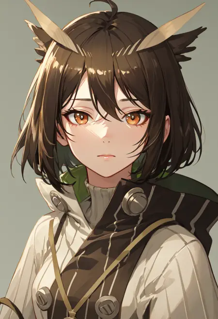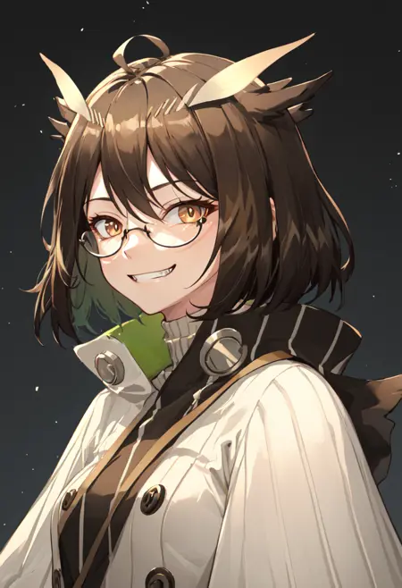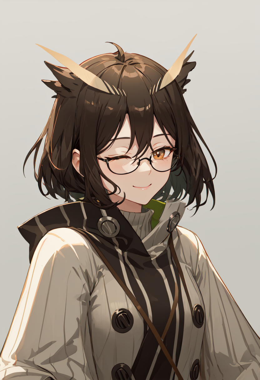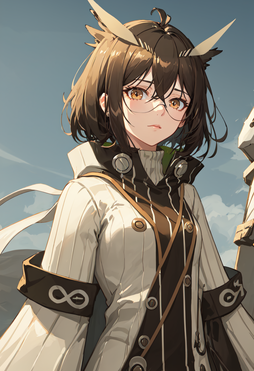 - 削減されたキャラクタータグは、茶色の髪、短髪、眼鏡、羽根のような髪、フクロウの耳、半フレーム眼鏡、茶色の目、目と目の間の髪、下フレーム眼鏡です。キャラクターの主要な特徴(例:髪の色)が安定しない場合、これらのタグをプロンプトに追加してください。
