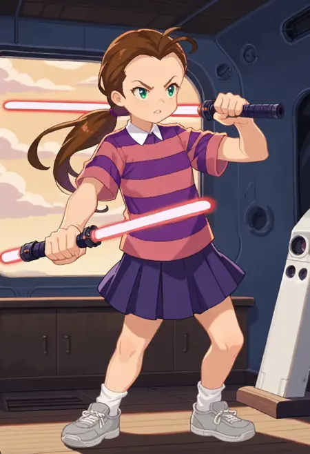 通常の服装: ポロシャツ, 縦縞シャツ, 短袖, 紫のシャツ, ピンクのシャツ, 紫のスカート, 白い靴下, アンクルソックス, スニーカー, 灰色の靴,
