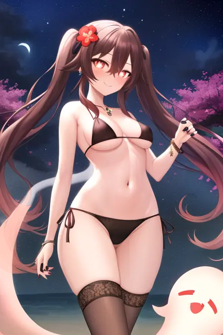 triggers wordはhu_tao_genshinで、推奨タグはmasterpiece, best quality, highres, solo, {hu_tao_genshin:1.10}, brown_hair, long_hair, red_eyes, symbol-shaped_pupils, twintails, bangs, very_long_hair, flower, flower-shaped_pupils, smile, blush, breasts, thighs, hair_between_eyes, plum_blossoms, black_nails, ghost, jewelry, hair_ornament, hair_flower, medium_breasts, small_breastsです。