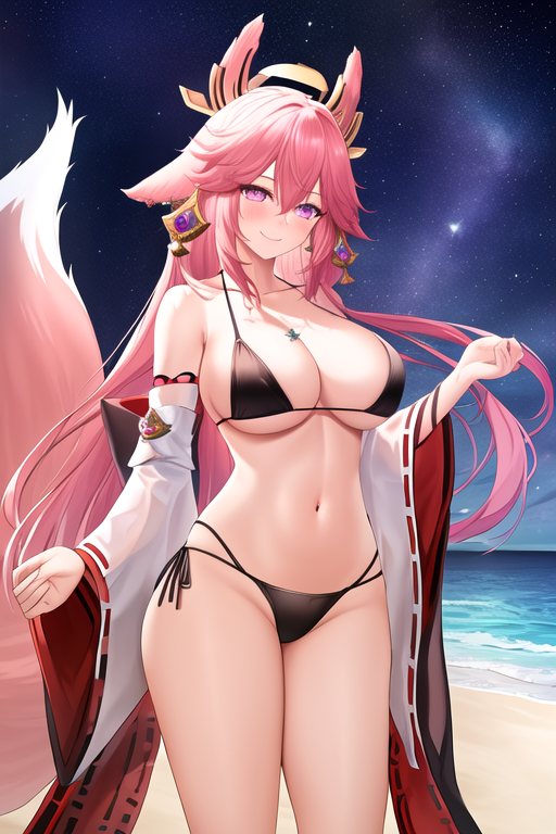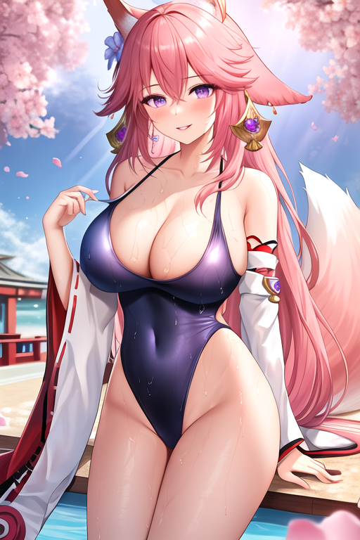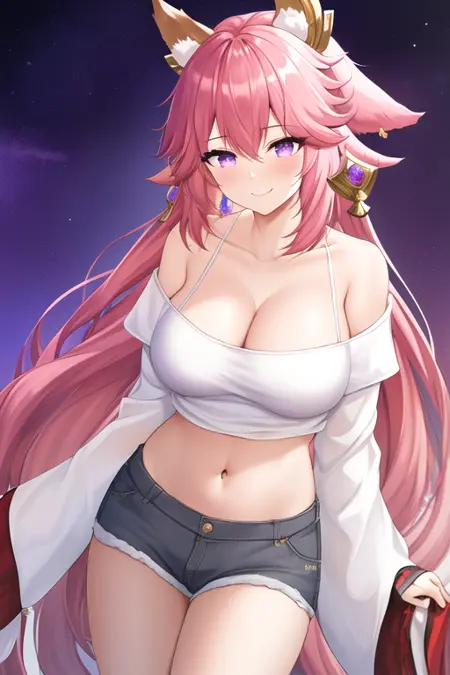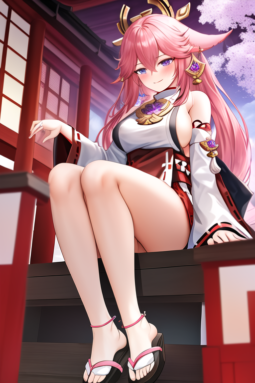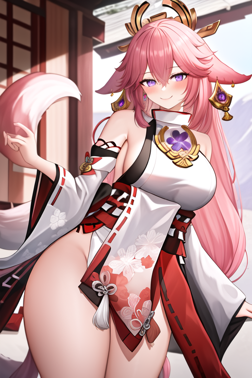 触发词为 yae_miko_genshin,推荐标签为:masterpiece, best quality, highres, solo, {yae_miko_genshin:1.10}, long_hair, pink_hair, purple_eyes, bangs, breasts, animal_ears, fox_ears, hair_between_eyes, jewelry, earrings, hair_ornament, smile, large_breasts, thighs, very_long_hair, blush, floppy_ears。