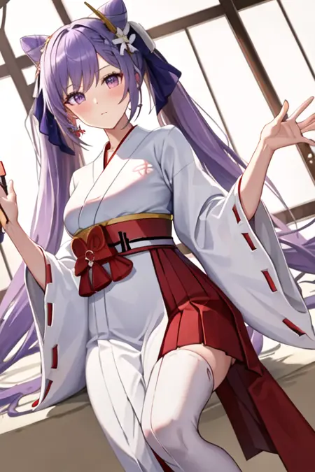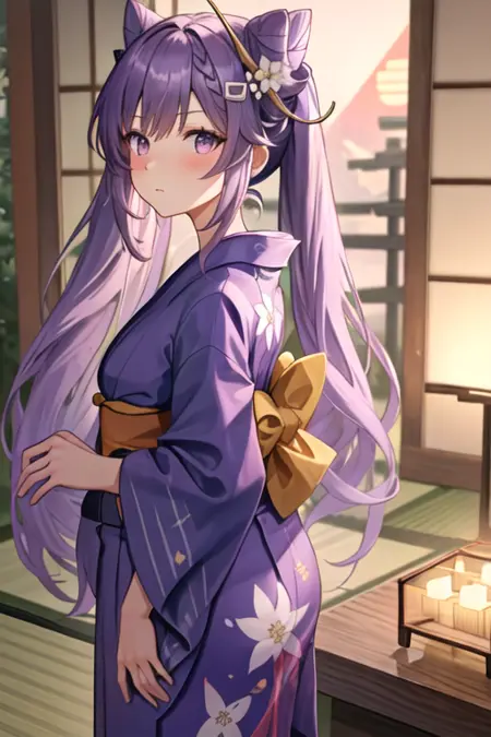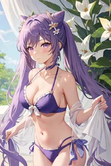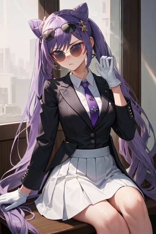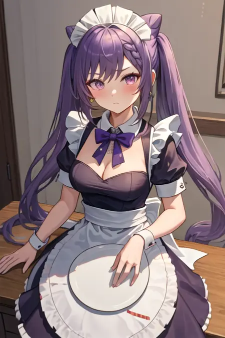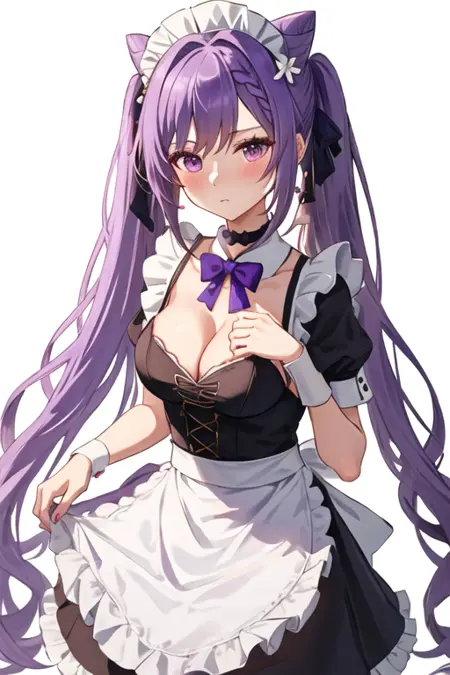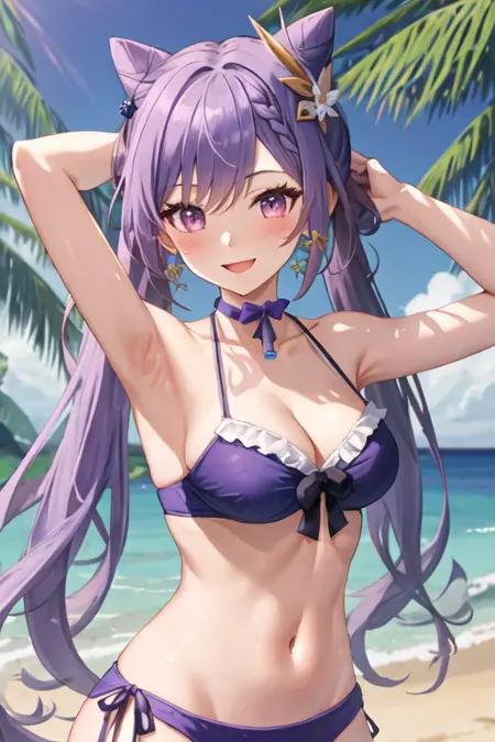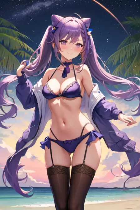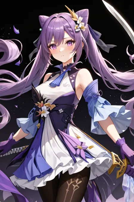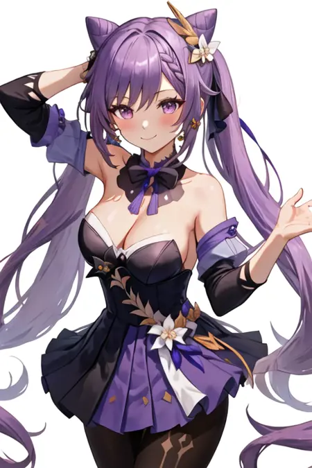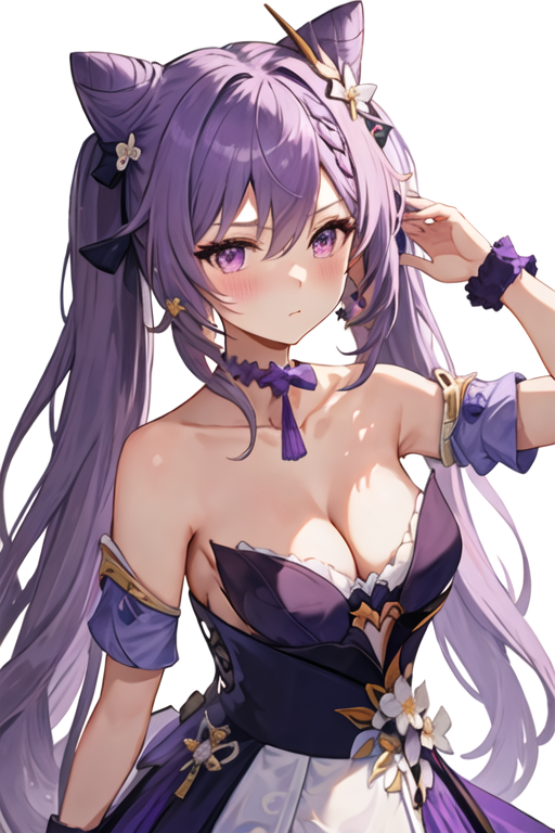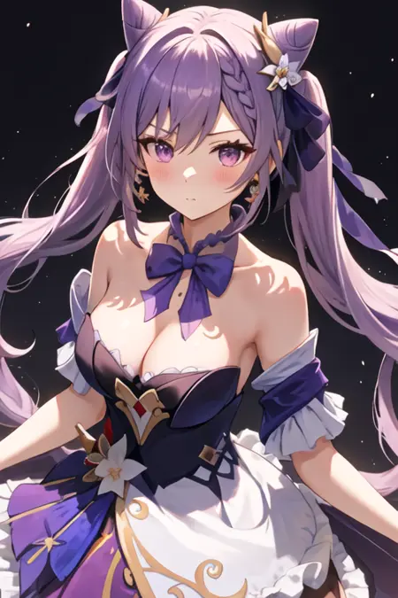 触发词为 keqing_genshin,建议标签为:masterpiece, best quality, highres, solo, {keqing_genshin:1.10}, long_hair, purple_hair, hair_bun, cone_hair_bun, purple_eyes, twintails, bangs, breasts, double_bun, hair_ornament, blush, medium_breasts, braid, cleavage, closed_mouth, large_breasts。