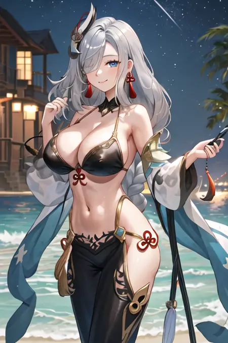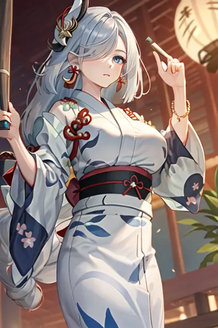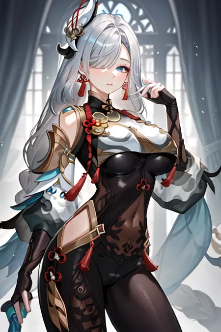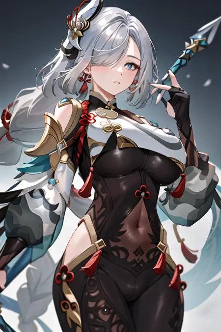 トリガーワードはshenhe_genshin、推奨タグはbest quality, masterpiece, highres, solo, {shenhe_genshin:1.15}, long_hair, blue_eyes, bangs, hair_over_one_eye, breasts, hair_ornament, large_breasts, jewelry, grey_hair, white_hair, tassel, earrings, very_long_hair, braid, breast_curtainです。