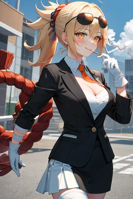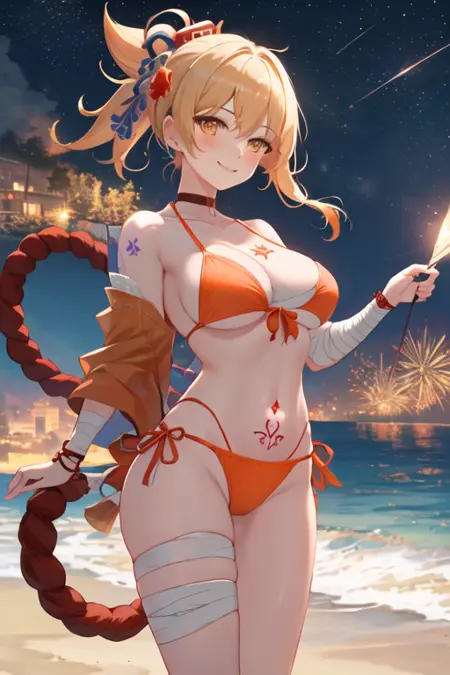 トリガー語はyoimiya_genshinで、推奨タグはmasterpiece, best quality, highres, solo, {yoimiya_genshin:1.10}, blonde_hair, bangs, breasts, hair_ornament, ponytail, tattoo, smile, yellow_eyes, bandages, arm_tattoo, sarashi, chest_tattoo, cleavage, rope, shimenawa, hadanugi_dousa, orange_eyes, bandaged_arm, sash, obi, medium_breasts, hair_between_eyes, large_breastsです。