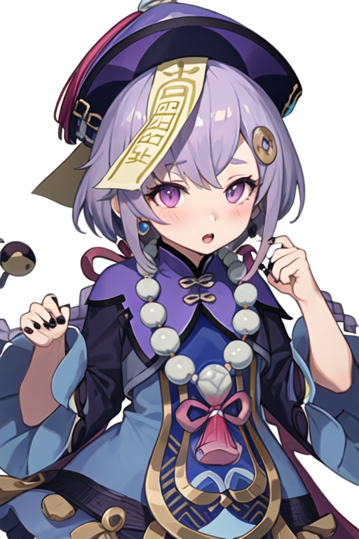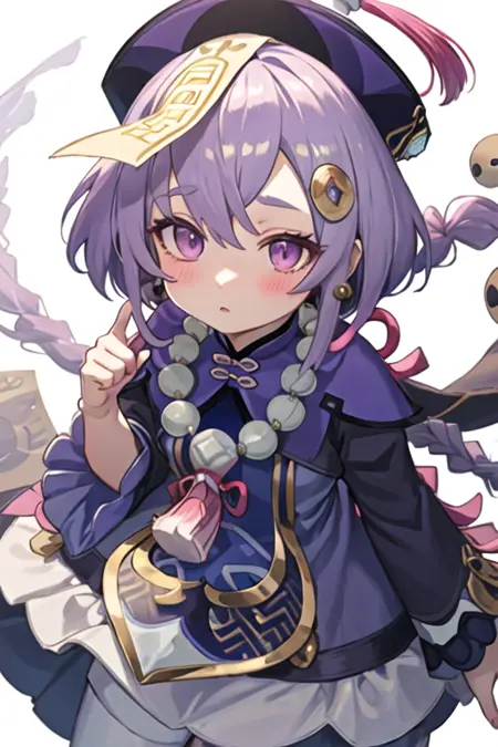 트리거 단어는 qiqi_genshin이며, 추천 태그는 masterpiece, best quality, highres, solo, {qiqi_genshin:1.10}, purple_hair, bangs, hat, ofuda, qing_guanmao, hair_ornament, purple_eyes, jewelry, jiangshi, necklace, beads, bead_necklace, long_hair, braid, coin_hair_ornament, purple_headwear, single_braid, hair_between_eyes입니다.