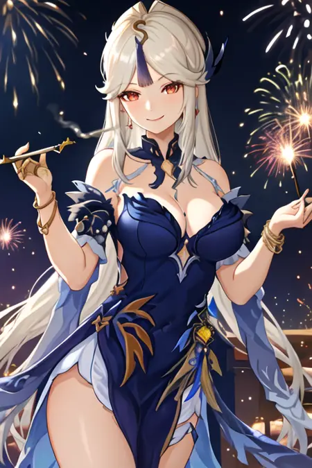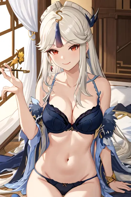 The trigger word is ningguang_genshin, and the recommended tags are masterpiece, best quality, highres, solo, {ningguang_genshin:1.10}, hair_ornament, long_hair, bangs, white_hair, breasts, red_eyes, tassel, parted_bangs, very_long_hair, sidelocks, smile, hairpin, large_breasts, hair_stick, thighs, tassel_hair_ornament.