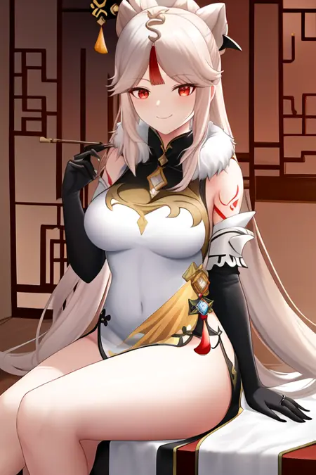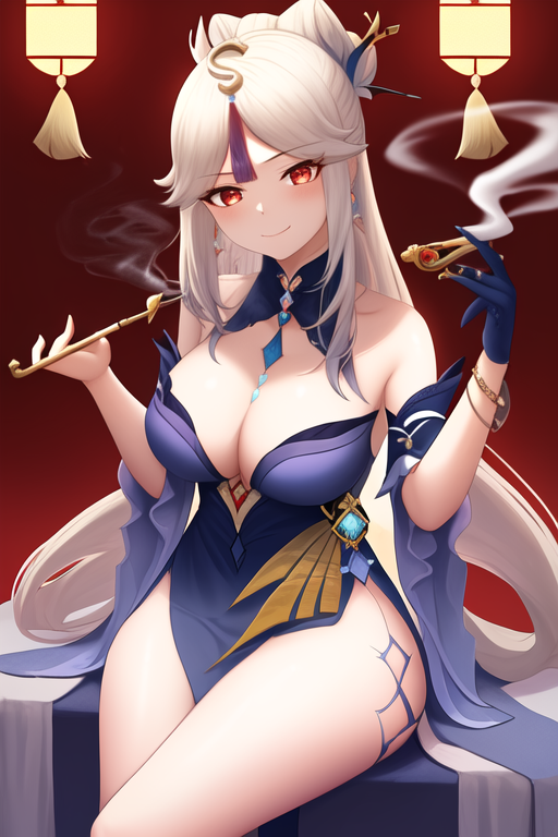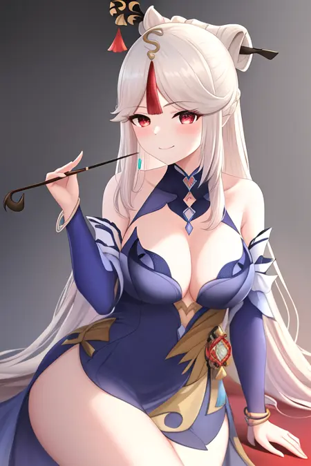 触发词为 ningguang_genshin,推荐标签为:masterpiece, best quality, highres, solo, {ningguang_genshin:1.10}, hair_ornament, long_hair, bangs, white_hair, breasts, red_eyes, tassel, parted_bangs, very_long_hair, sidelocks, smile, hairpin, large_breasts, hair_stick, thighs, tassel_hair_ornament