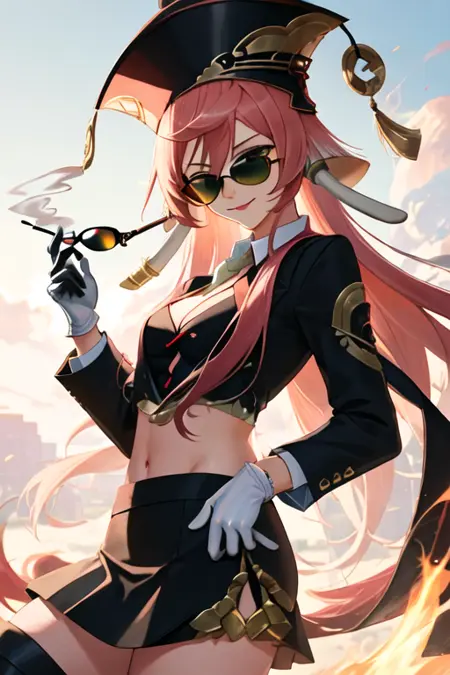 触发词为 yanfei_genshin,推荐标签为:best quality, masterpiece, highres, solo, {yanfei_genshin:1.15}, pink_hair, long_hair, green_eyes, hair_between_eyes, bangs, hat, red_headwear, antlers, smile, breasts, small_breasts, cleavage, midriff, horns。
