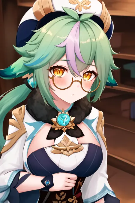 The trigger word is sucrose_genshin, and the recommended tags are best quality, masterpiece, highres, solo, {sucrose_genshin:1.15}, green_hair, animal_ears, glasses, semi-rimless_eyewear, hat, bangs, vision_\(genshin_impact\), blush, multicolored_hair, long_hair, hair_between_eyes, cat_ears, orange_eyes, breasts, yellow_eyes.