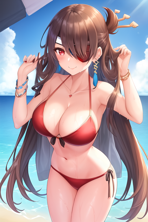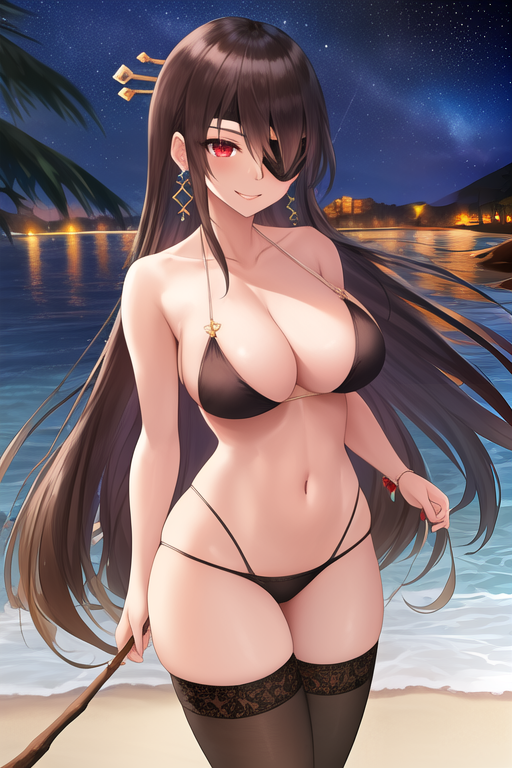 The trigger word is beidou_genshin, and the recommended tags are best quality, masterpiece, highres, solo, {beidou_genshin:1.15}, long_hair, eyepatch, red_eyes, brown_hair, hair_ornament, hair_over_one_eye, breasts, one_eye_covered, hairpin, smile, hair_stick, jewelry, bangs, earrings, large_breasts, cleavage.