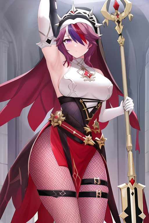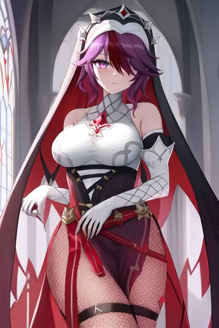 触发词为 rosaria_genshin,推荐标签为:best quality, masterpiece, highres, solo, {rosaria_genshin:1.15}, purple_hair, red_hair, short_hair, nun, breasts, large_breasts, bangs, veil, purple_eyes, habit, multicolored_hair, streaked_hair, hair_between_eyes, fishnets, hair_over_one_eye。