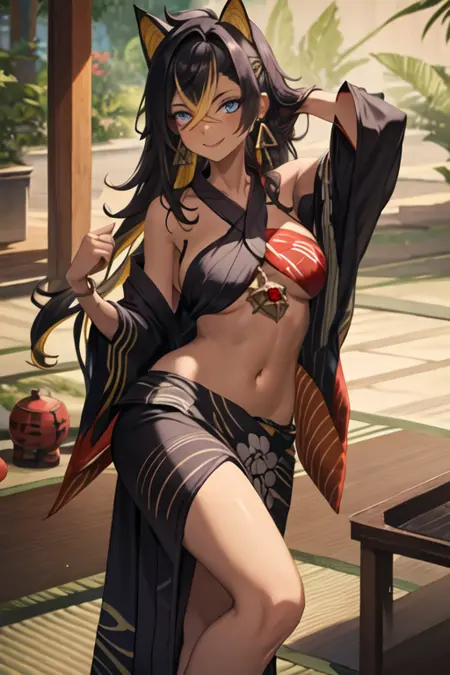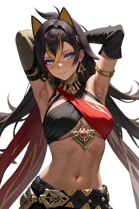 The trigger word is dehya_genshin, and the recommended tags are best quality, masterpiece, highres, solo, {dehya_genshin:1.15}, multicolored_hair, long_hair, bangs, blue_eyes, streaked_hair, dark-skinned_female, dark_skin, blonde_hair, black_hair, hair_between_eyes, jewelry, crossed_bangs, halterneck, earrings, animal_ears, breasts, criss-cross_halter, smile, brown_hair, navel, stomach, large_breasts, hair_intakes.