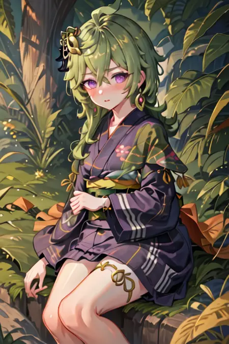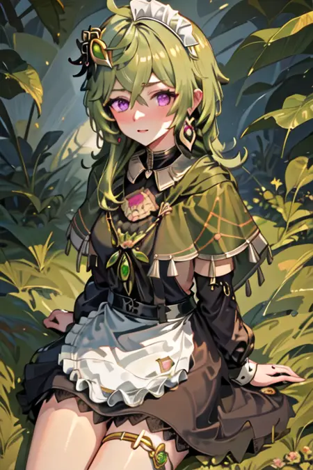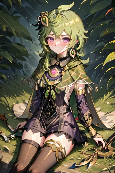 トリガー語はcollei_genshinで、推奨タグはbest quality, masterpiece, highres, solo, {collei_genshin:1.15}, green_hair, bangs, purple_eyes, hair_ornament, hair_between_eyes, jewelry, capelet, earrings, ahoge, green_capelet, blush, crossed_bangs, medium_hairです。