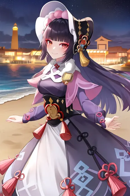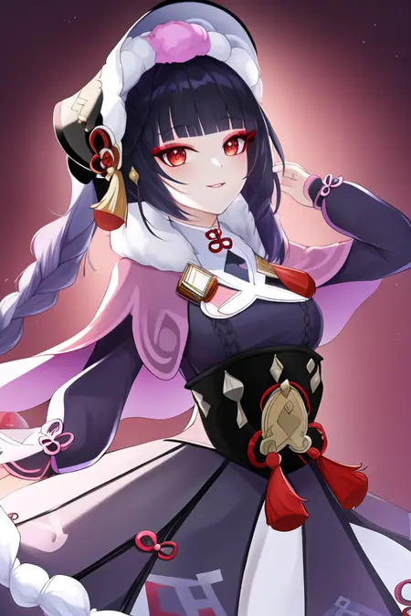 The trigger word is yun_jin_genshin, and the recommended tags are best quality, masterpiece, highres, solo, {yun_jin_genshin:1.15}, bangs, blunt_bangs, long_hair, red_eyes, black_hair, bonnet, smile, capelet, vision_\(genshin_impact\), tassel, pink_capelet, purple_hair, makeup, closed_mouth.