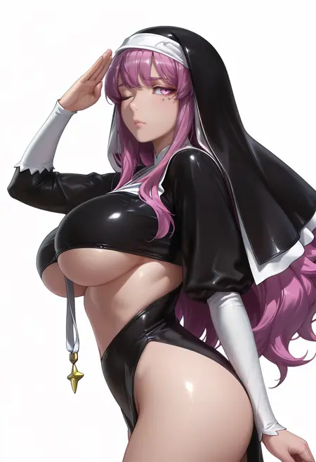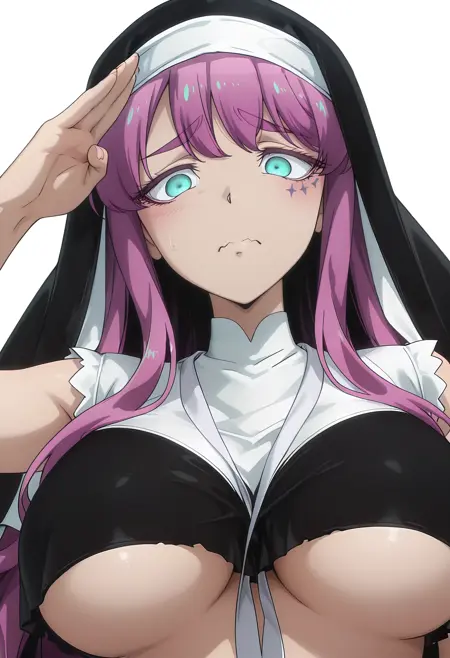 sister_gigant, long hair, purple hair, large breasts, bangs,aqua eyes, facial mark,