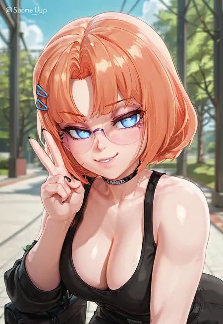 Glasses, hair clip, blue eyes, short hair, orange hair, bangs, choker,