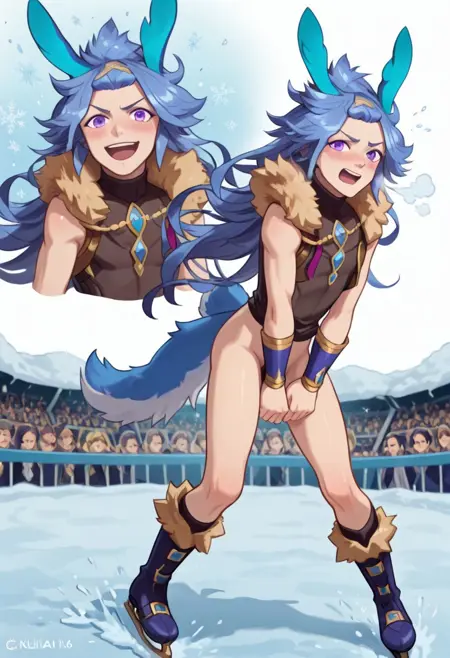 奥赛姆,德拉加利亚失落,动物耳朵,蓝发,兔耳,蓝色动物尾巴,紫眼,长发,肚脐,长裤,露脐,毛皮镶边,靴子,咧嘴笑,冰鞋