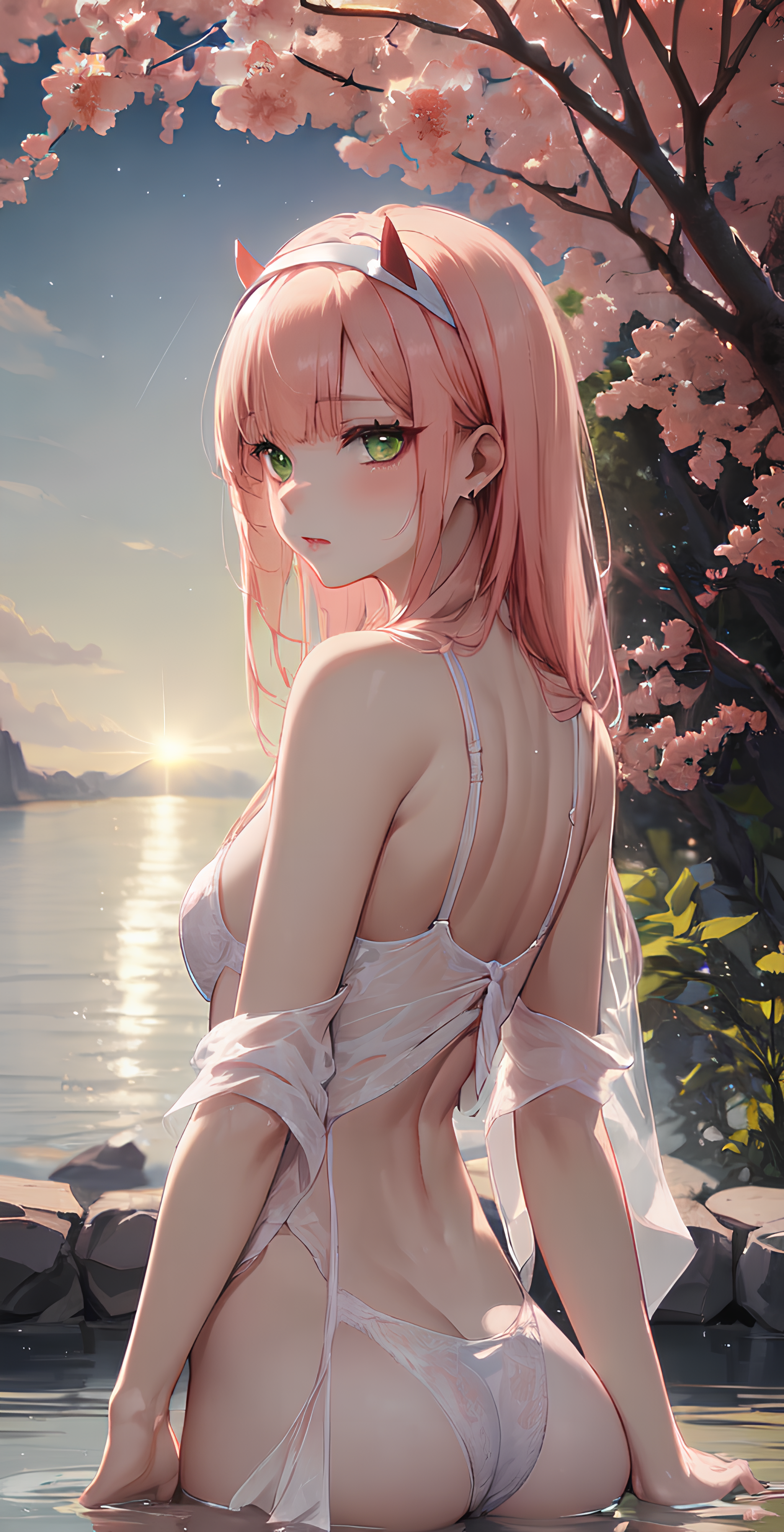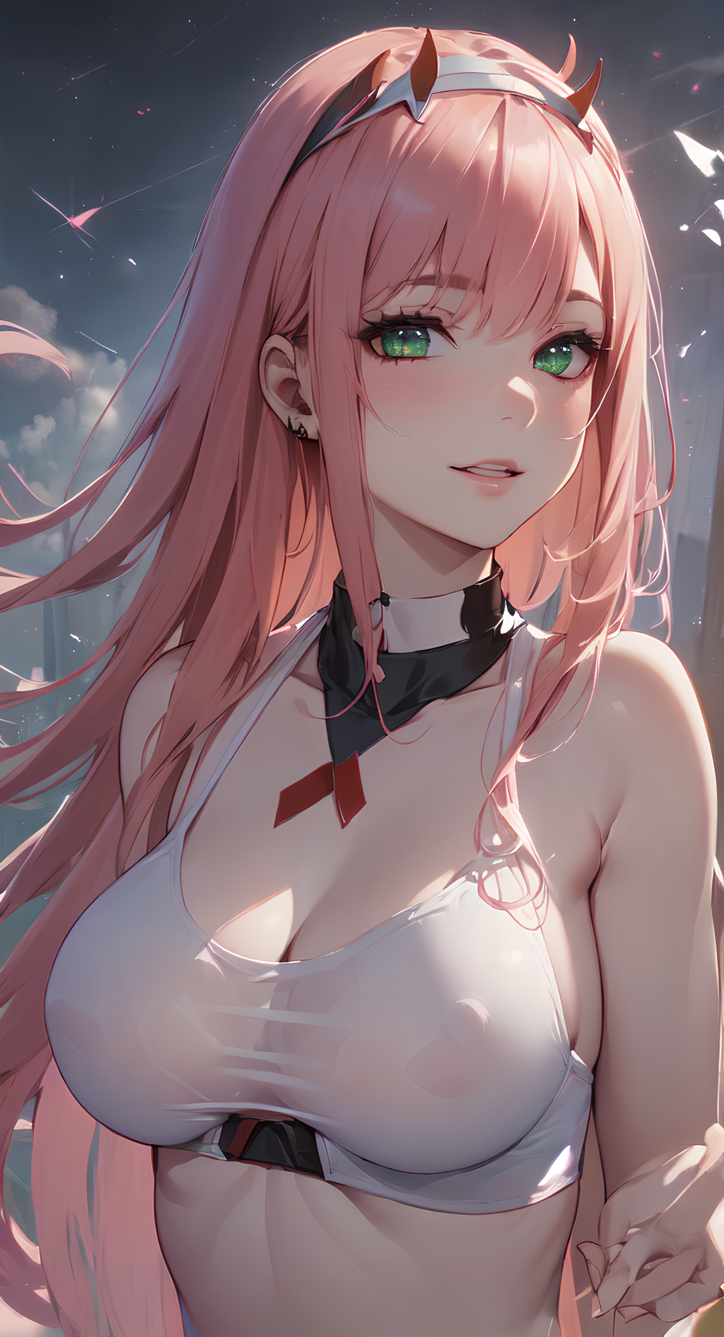 身体提示词:长发,粉红色头发,发带,刘海,角,绿眼睛,白色发带,肚脐,制服