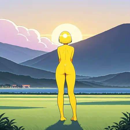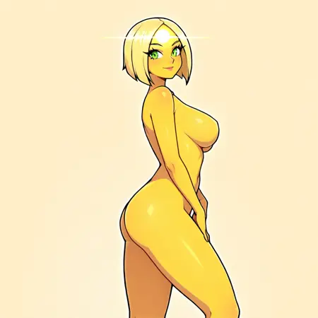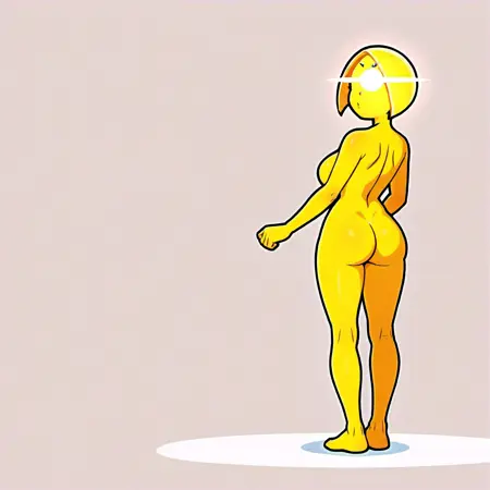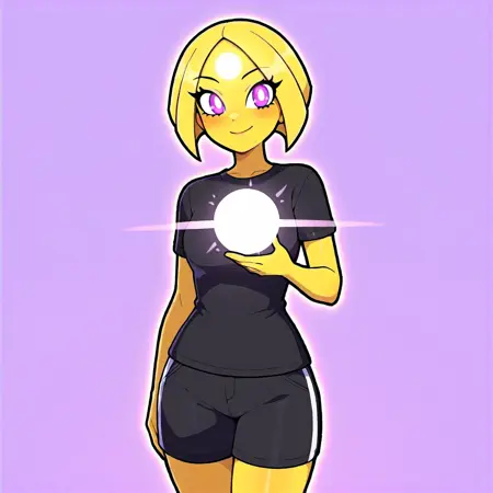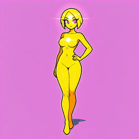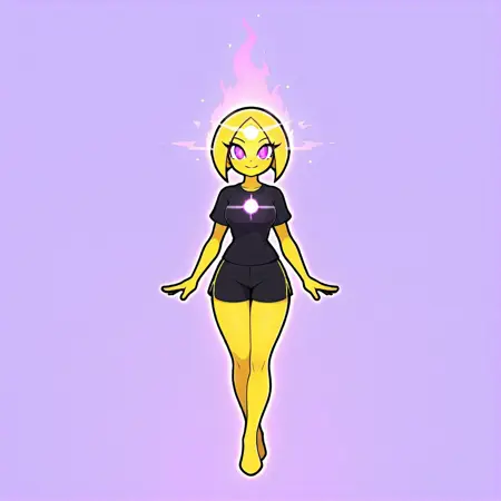 캐릭터 특성: 피부와 머리카락을 포함해 전체가 노란색 또는(발광하는 흰색 및/또는 노란색)입니다. 아래쪽이 날카로운 점으로 끝나는 짧은 머리카락으로 머리가 원형을 이룹니다. 이마에는 시점과 관계없이 수평으로 뻗어 나가는 두 개의 복사선이 있는 흰색 원이 있습니다. 흰색 동공을 가진 밝은 보라색 눈. 캐릭터 전체를 둘러싼 발광 테두리가 있으며, 어두운 공간에서도 빛납니다. 옷은 입지 않거나 검은 옷을 입습니다. 이마의 주된 원과 유사하게 가슴(또는 다른 차크라 위치)에 추가적인 밝은 원이 있을 수 있지만, 이는 이마의 주된 원을 대체하지 않습니다.
