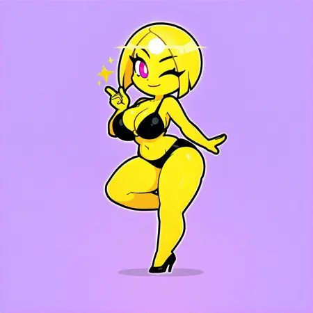 완전한 SID 캡션: sun woman, chibi, wink, black bikini, simple background, black heels, standing, on one leg, purple background, smile, curvy, 1girl
