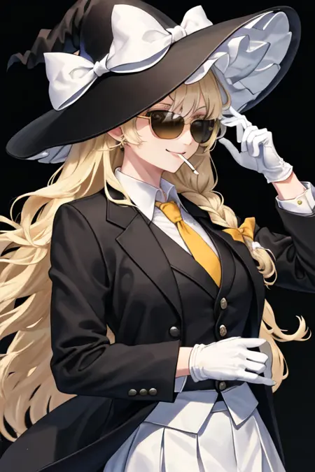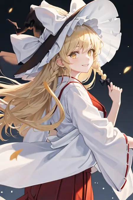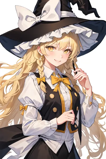 The trigger word is kirisame_marisa_touhou, and the recommended tags are best quality, masterpiece, highres, solo, {kirisame_marisa_touhou:1.15}, blonde_hair, long_hair, hat, witch_hat, bow, yellow_eyes, braid, single_braid, hat_bow, smile, hair_bow, white_bow, bangs, black_headwear, upper_body.
