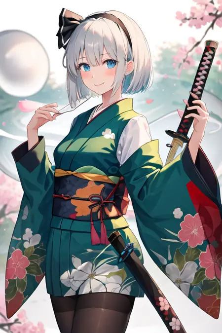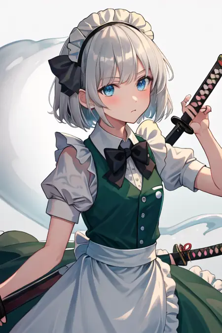 触发词为 konpaku_youmu_touhou,推荐标签为:best quality, masterpiece, highres, solo, {konpaku_youmu_touhou:1.15}, short_hair, ribbon, hairband, black_hairband, hair_ribbon, black_ribbon, bangs, white_hair, vest, blue_eyes, green_vest, sword, katana, hitodama, bow, blush, upper_body, black_bow, grey_hair。