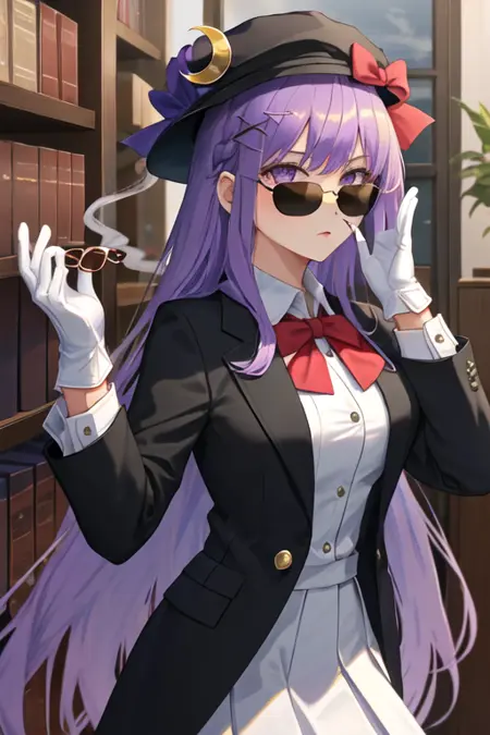 The trigger word is patchouli_knowledge_touhou, and the recommended tags are best quality, masterpiece, highres, solo, {patchouli_knowledge_touhou:1.15}, long_hair, purple_hair, crescent, purple_eyes, ribbon, hat, bow, bangs, mob_cap, hat_ornament, crescent_hat_ornament, hair_bow, red_bow, blue_bow, upper_body, book, red_ribbon, capelet, hat_ribbon, striped, very_long_hair.