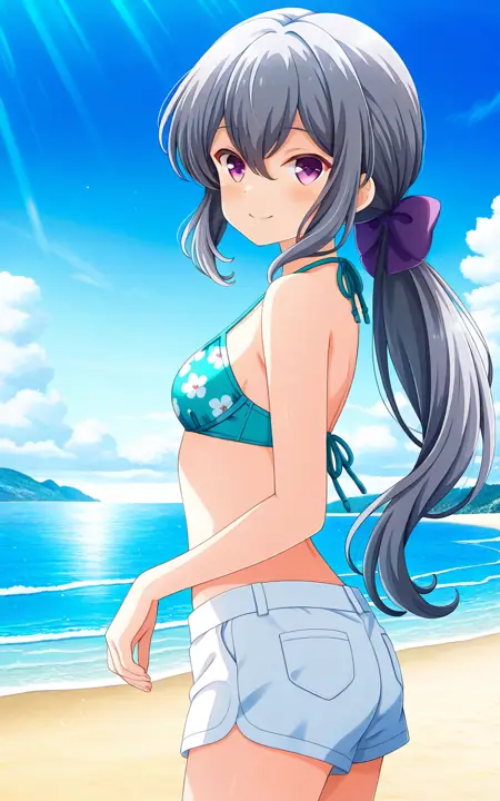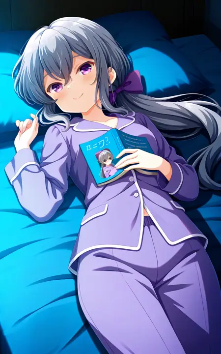 トリガーワード: shigetoakiho、灰色の髪、低めのポニーテール、パープルのリボン、髪のリボン、額に髪がかかる、非常に長い髪、パープルの目