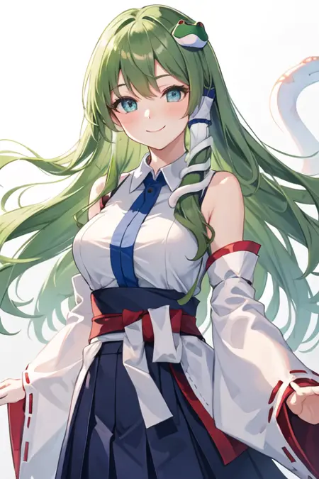 トリガー語はkochiya_sanae_touhouで、推奨タグはbest quality, masterpiece, highres, solo, {kochiya_sanae_touhou:1.15}, green_hair, long_hair, hair_ornament, frog_hair_ornament, snake_hair_ornament, hair_tubes, blush, bangs, breasts, smile, green_eyes, upper_body, blue_eyesです。