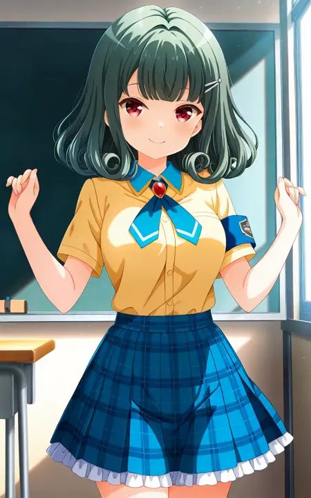 green hair, hair intakes, blunt bangs, hairclip, curly hair, medium hair, red eyes, medium breasts