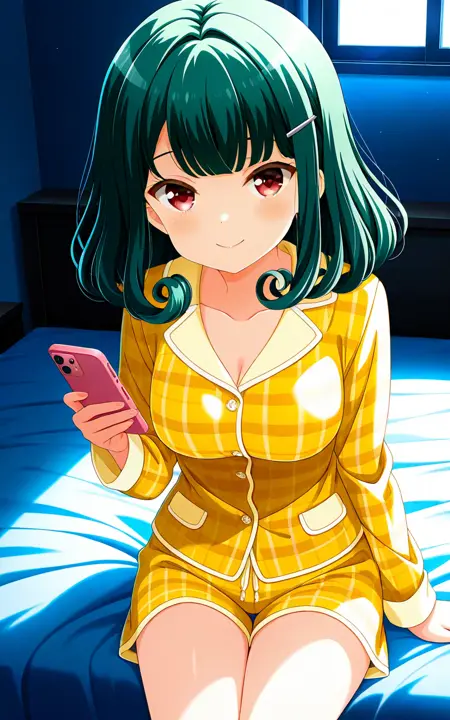 触发词:shinomiyarisa,绿发,发丝吸入,齐刘海,发夹,卷发,中长发,红眼