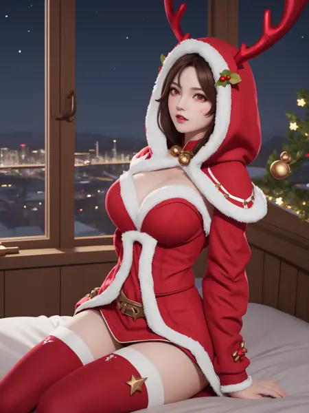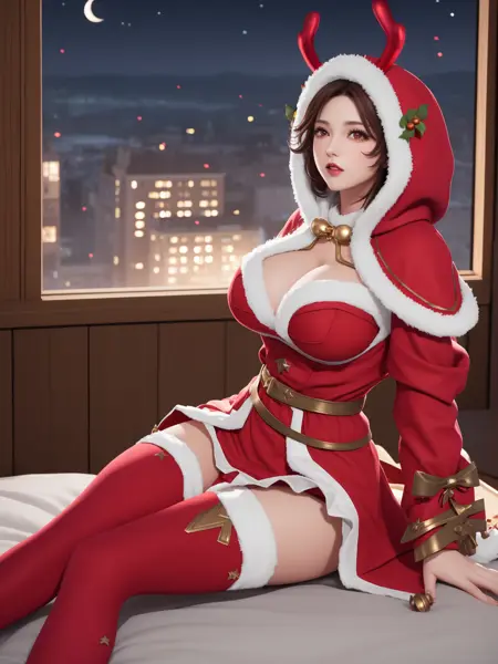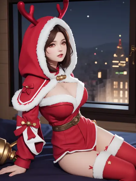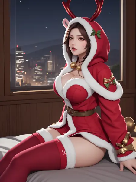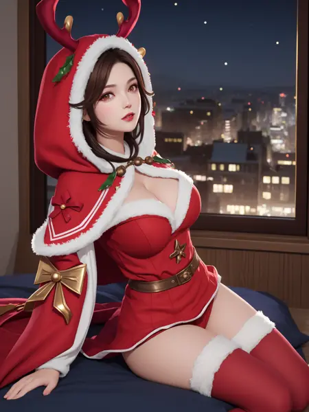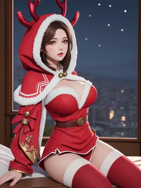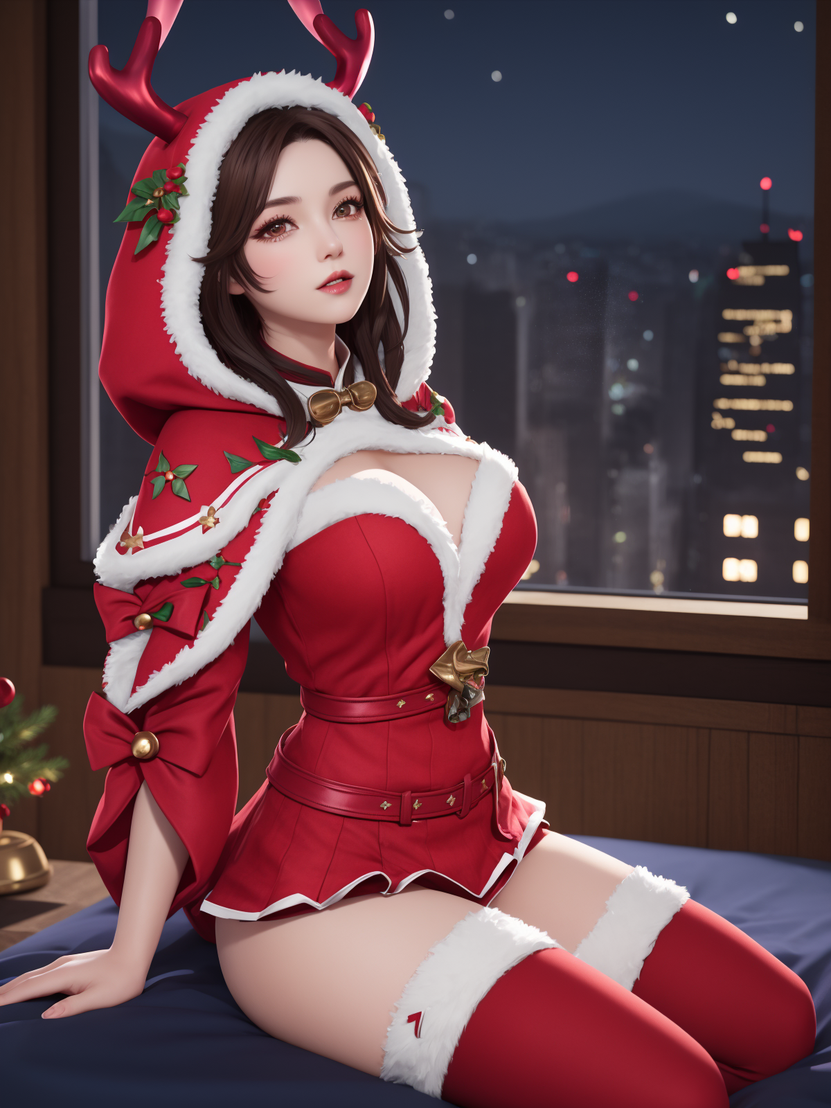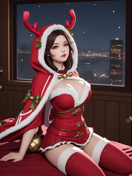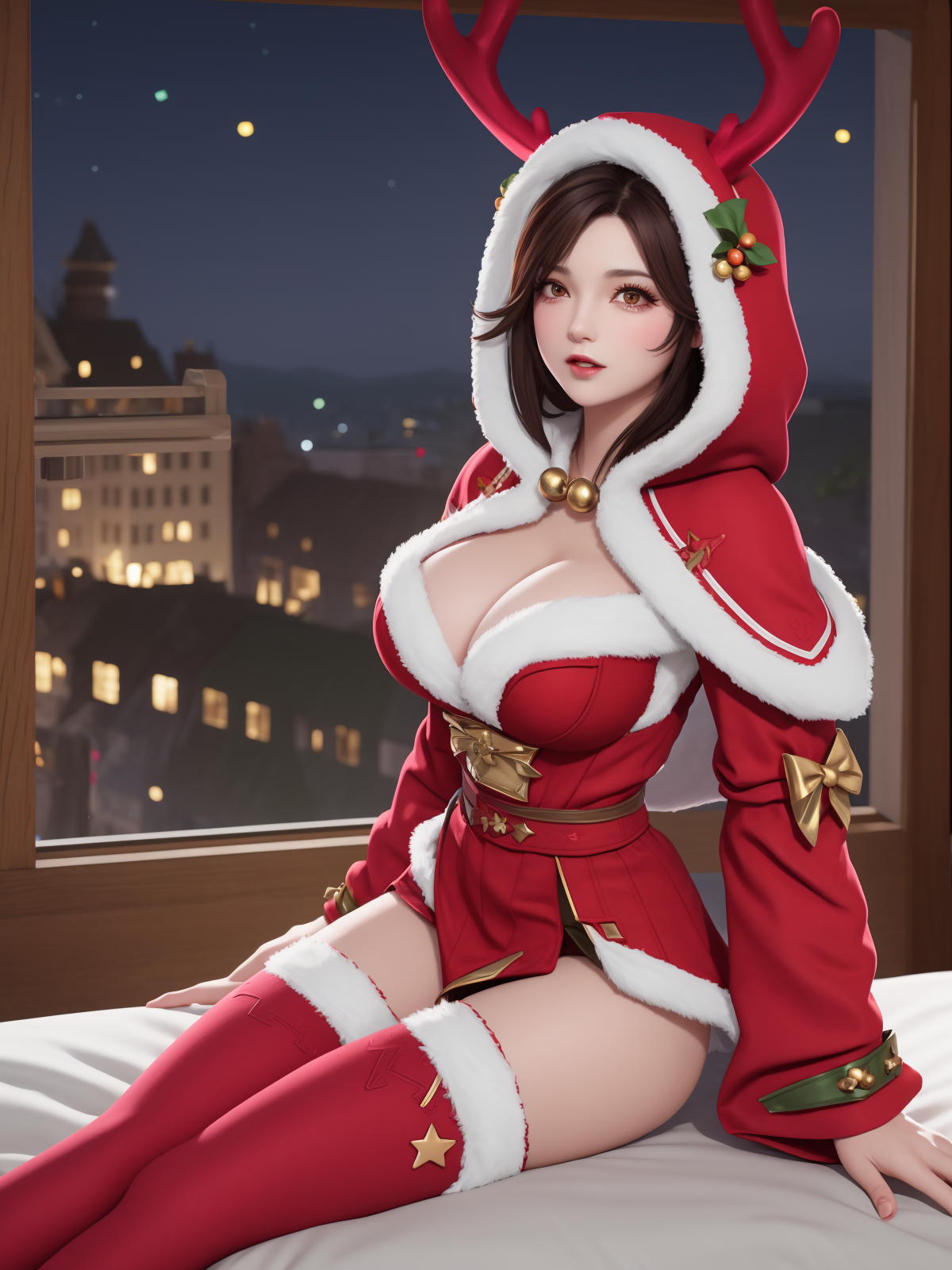 - WZRYdiaochanSDLG, 1girl, solo, antlers, bell, thighhighs, choker, brown hair, looking at viewer, hood, reindeer antlers, skirt, breasts, brown eyes, short hair, neck bell, fur trim, garter straps, dress, cleavage, wide sleeves, cityscape, pool, night, mature female, fur-trimmed legwear,