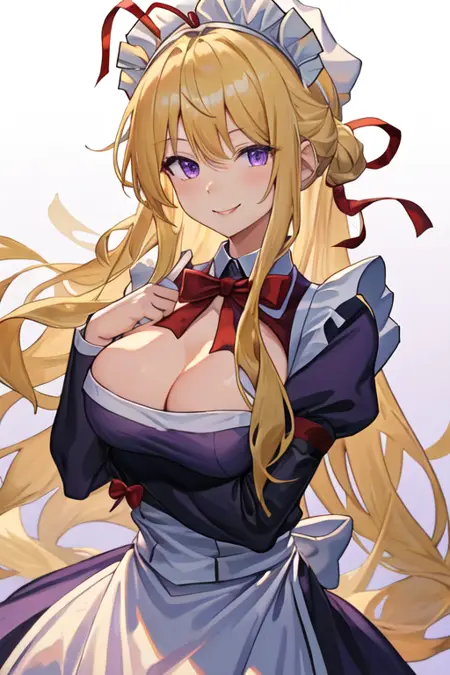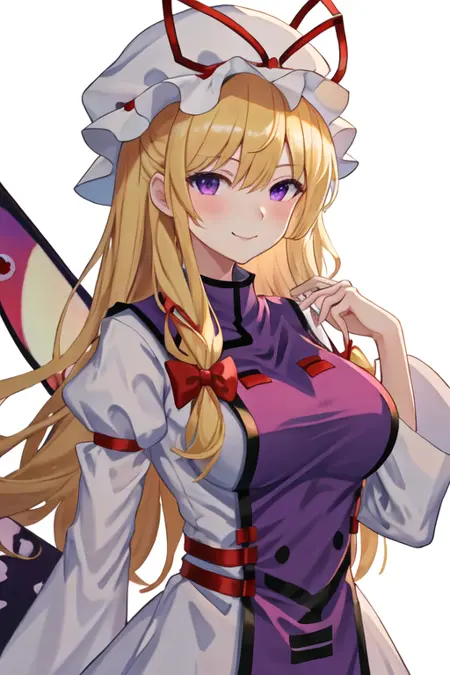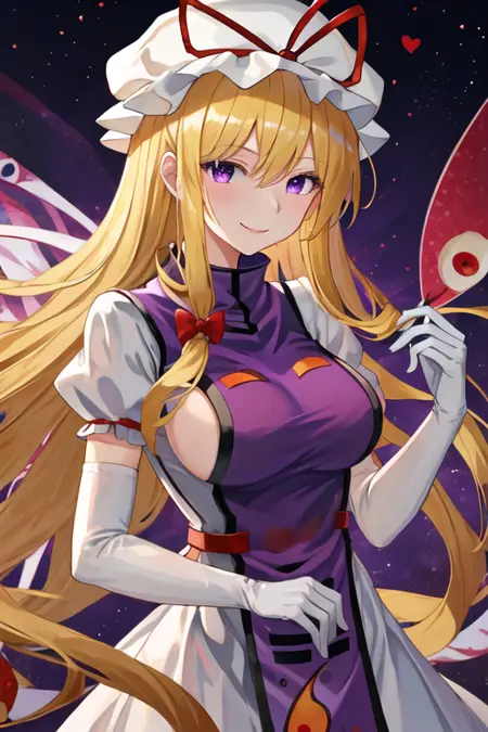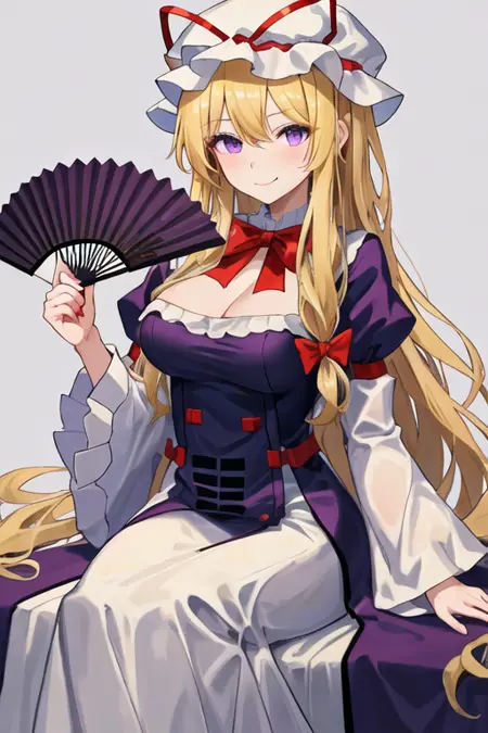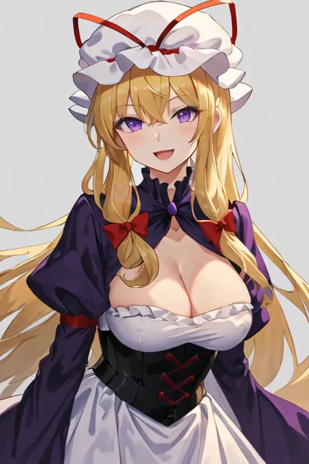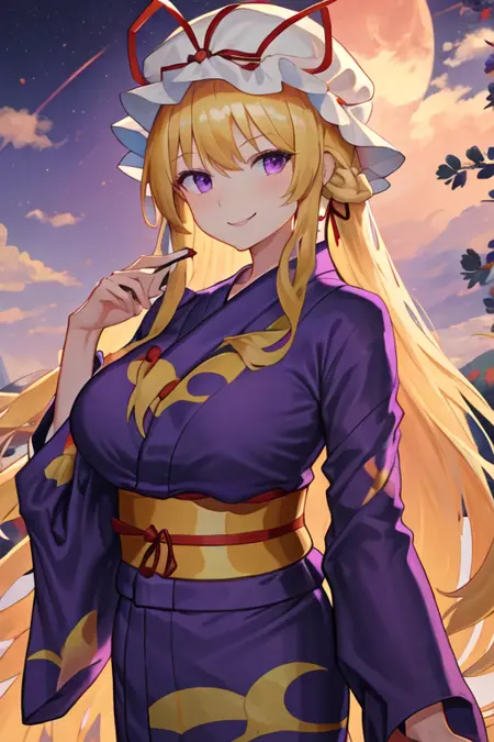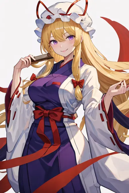 触发词为 yakumo_yukari_touhou,推荐标签为:best quality, masterpiece, highres, solo, {yakumo_yukari_touhou:1.15}, blonde_hair, ribbon, hat, long_hair, mob_cap, hat_ribbon, red_ribbon, smile, white_headwear, bangs, bow, breasts, purple_eyes, hair_between_eyes, hair_bow, tabard, upper_body, large_breasts, very_long_hair。
