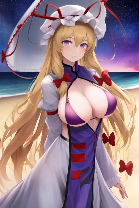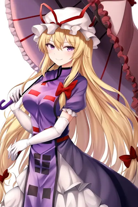 트리거 단어는 yakumo_yukari_touhou이며, 권장 태그는 best quality, masterpiece, highres, solo, {yakumo_yukari_touhou:1.15}, blonde_hair, ribbon, hat, long_hair, mob_cap, hat_ribbon, red_ribbon, smile, white_headwear, bangs, bow, breasts, purple_eyes, hair_between_eyes, hair_bow, tabard, upper_body, large_breasts, very_long_hair입니다.