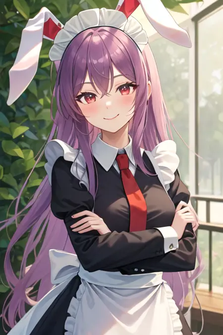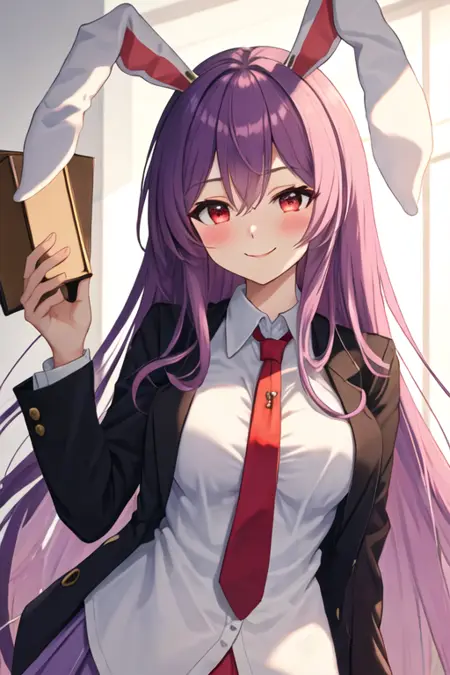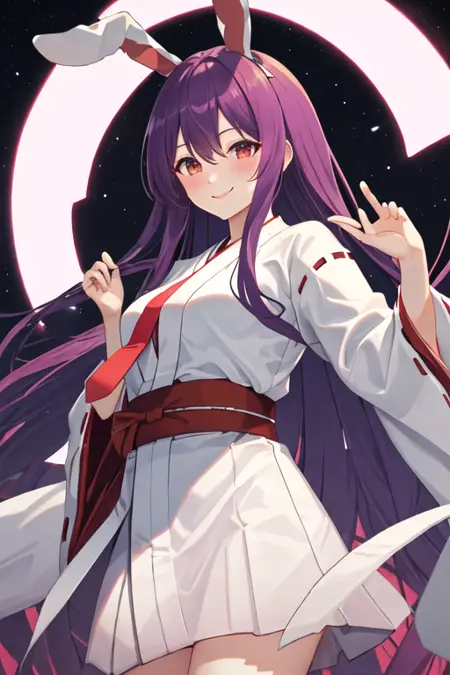 The trigger word is reisen_udongein_inaba_touhou, and the recommended tags are best quality, masterpiece, highres, solo, {reisen_udongein_inaba_touhou:1.15}, animal_ears, long_hair, rabbit_ears, red_eyes, purple_hair, necktie, red_necktie, bangs, blush, very_long_hair, breasts, smile, hair_between_eyes.